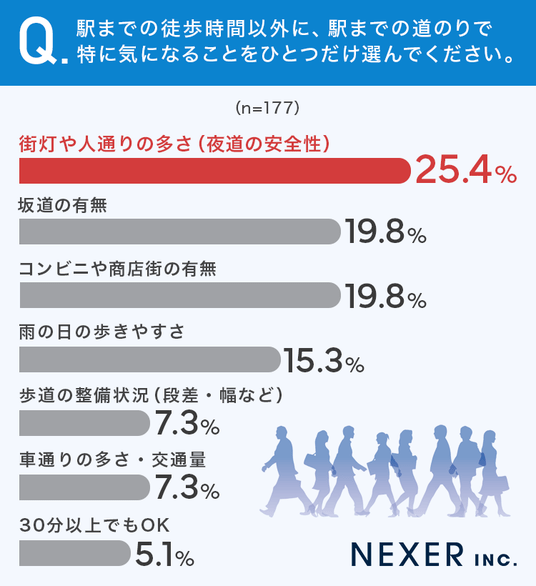 駅までの道のりで最も気になるのは「街灯や人通りの多さ」で25.4%でした。