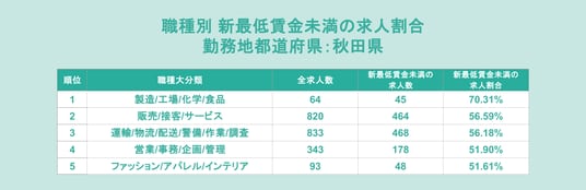 1位の秋田県では「製造/工場/化学/食品」が70.31%で最大となり、次いで「販売/接客/サービス」が56.59%、「運輸/物流/配送/警備/作業/調査」が56.18%と続きました。
