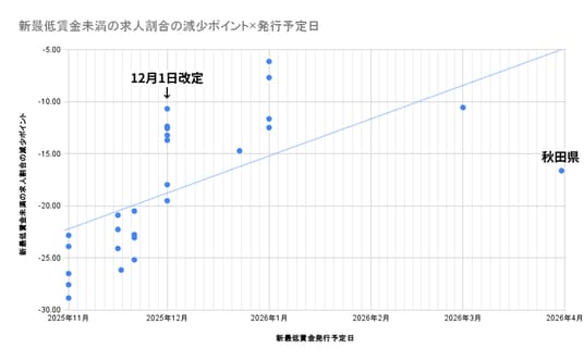 続いて、2025年11月以降に改定が行われる地域の新最低賃金発効日と、新最低賃金未満の求人割合の減少幅を比較してみます。改定予定日が近いほど減少幅が大きい傾向は確認できるものの、秋田県(発効予定:2026年3月31日、−16.62pt)は、12月1日改定組の平均(−14.34pt)や中央値(−13.46pt)を上回る減少幅を示しています。12月1日改定地域の範囲(−19.5~−10.7pt)の中でも上位に位置し、すでに多くの地域より新最低賃金未満の求人割合が減少しています。