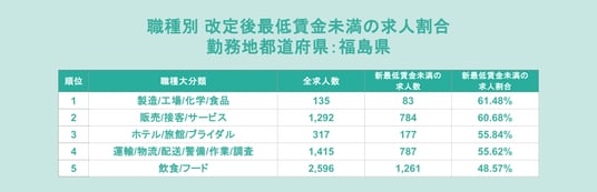 次に2位の福島県では、「製造/工場/化学/食品」が61.48%で最大となりました。続いて「販売/接客/サービス」が60.68%、「ホテル/旅館/ブライダル」が55.84%と続いています。