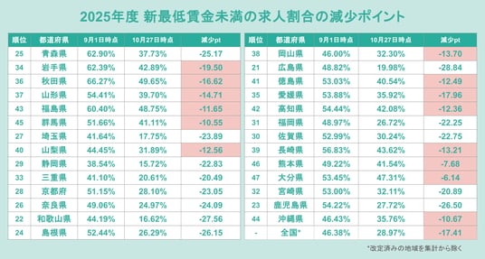 ・改定済みの地域を除き、2025年度の改定後最低賃金に満たない求人は全国で28.97%となり、9月時点(46.38%)から17.41pt改善。改定の反映が全国的に進んでいることが明らかに