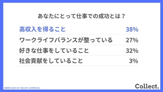 働き方の多様化が進み、終身雇用や年功序列といった従来の価値観が薄れつつある中、「仕事の成功」をどう捉えるかは世代や環境によって大きく異なっています。若年層では給与やポジションよりも「好きなことを仕事にしたい」という価値観が広がる一方で、生活基盤を重視する層では経済的な安定を成功とみなす傾向も根強く見られます。そこで今回、「Collect.(コレクト)」では、20代~50代の男性を対象に「仕事での成功とは何か」について意識調査を実施しました。