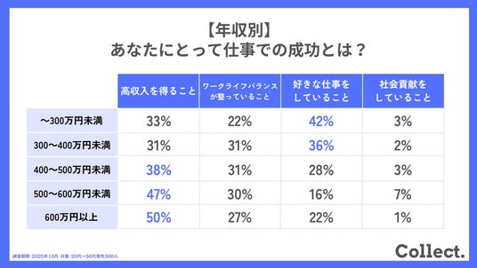 収入向上とともに成果・報酬を成功指標とする比重が高まり、低~中所得帯では”好き”を軸にした成功観が比較的強い構図が示されています。