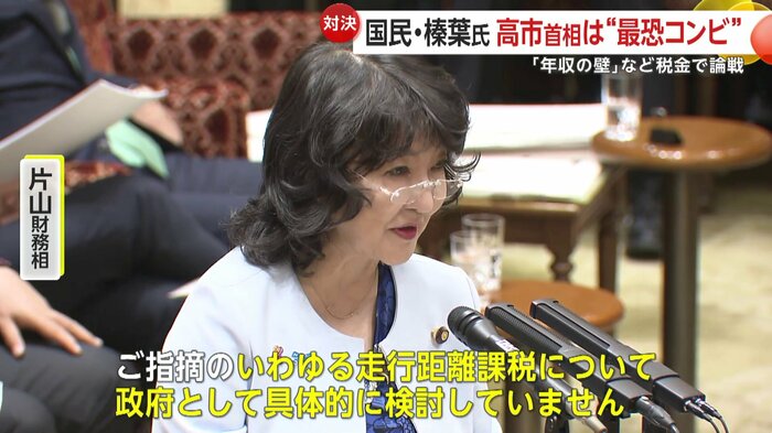 また、榛葉幹事長は、自動車をめぐる税金について、“最恐コンビ”の片山財務大臣に問い質した。