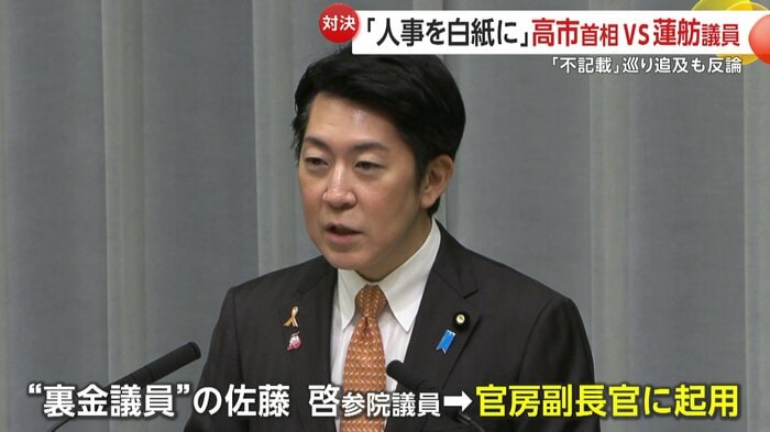 政治資金収支報告書に不記載があった、佐藤官房副長官の起用について厳しく追及した。