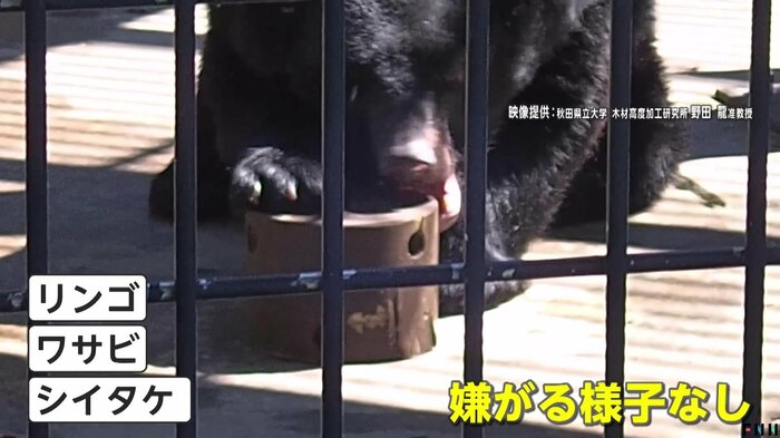 リンゴやワサビ、シイタケを入れた丸太に嫌がる様子は見られなかった。