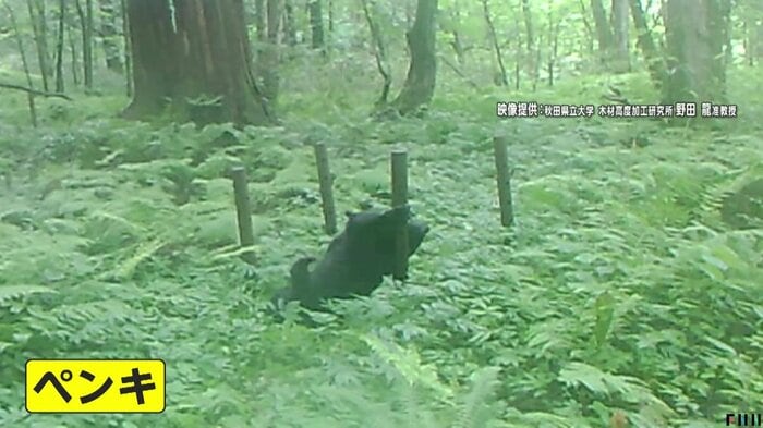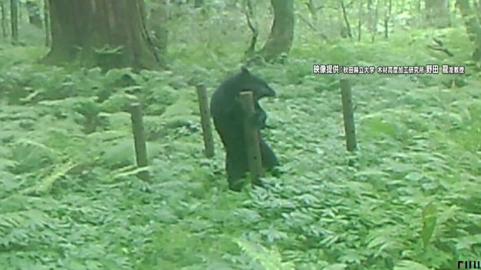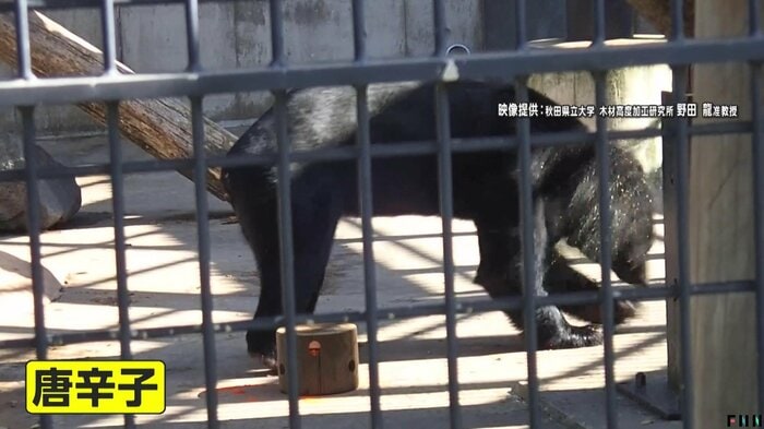 秋田県立大学の野田龍准教授が行った、強いにおいのする物質が入った丸太にクマがどのような反応をするか調べた「クマの嗅覚」についての実験映像。