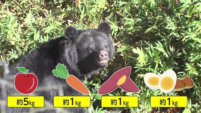 クマは冬眠に入ると何も食べないため、秋の間は通常の3倍ほどの餌を与え、たくさんの脂肪を蓄えるという。