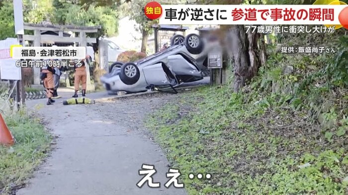 6日午前10時半頃、福島・会津若松市の神社の参道で目撃されたのは、ドアが開いた状態でひっくり返るシルバーの車。