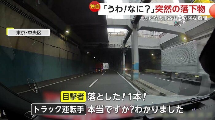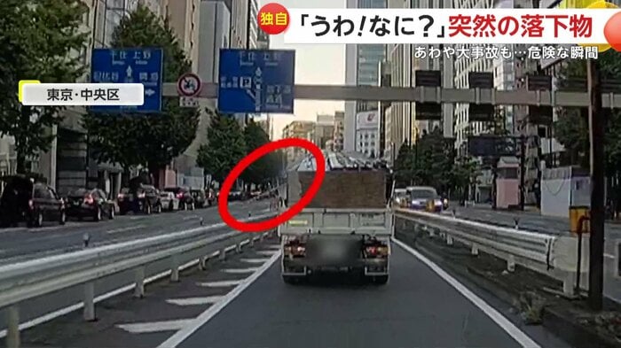 東京・中央区で7日午前6時半ごろ、前を走るトラックの荷台から棒状のものが落下した。