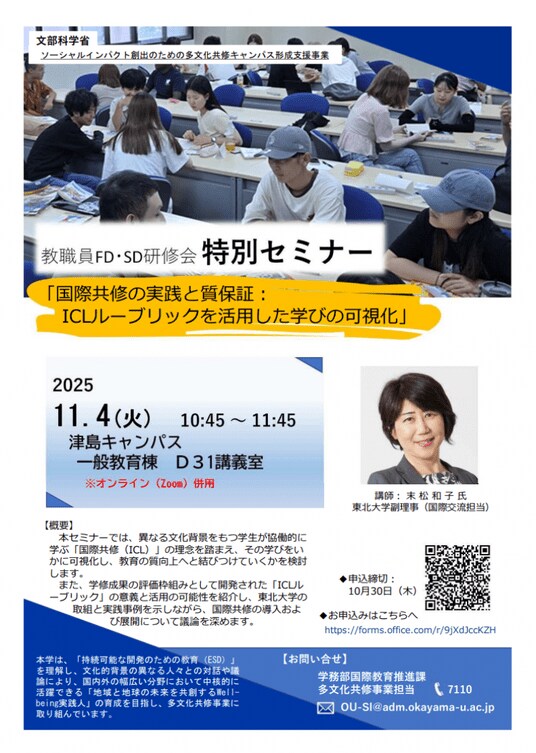 国立大学法人岡山大学(本部:岡山市北区、学長:那須保友)は、2025年11月4日、2024年度に文部科学省より採択を受けた「ソーシャルインパクト創出のための多文化共修キャンパス形成支援事業(多文化共修事業)」の一環として、同事業採択大学である東北大学副理事(国際交流担当)の末松和子氏を招き、特別セミナー「国際共修の実践と質保証:ICL※ルーブリックを活用した学びの可視化」をハイブリッド形式で開催し、約100人の教職員が参加しました。
