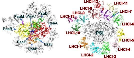 図. ユーグレナPSI-LHCIの立体構造。左図はPSIの各サブユニットを、右図はLHCIの各サブユニットをそれぞれラベルした。