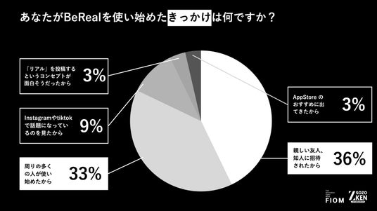 BeRealを使い始めたきっかけは、「親しい友人、知人に招待されたから」(36%) 、「周りの多くの人が使い始めたから」(33%) がトップ2を占め、合計69%が友人関係・コミュニティ起点で始めていることがわかりました。