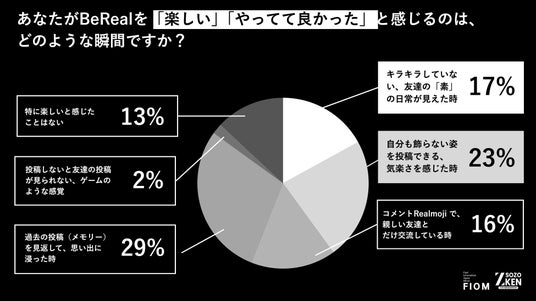 BeRealを「楽しい」と感じる瞬間、「過去の思い出を見返した時」(29%)、「友達の素が見えた時」(17%)。
