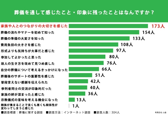 「葬儀を通して感じたこと・印象に残ったことはなんですか?(複数回答可)」と質問したところ、「家族や人とのつながりの大切さを感じた」(173人)、「葬儀の流れやマナーを初めて知った」(154人)、「葬儀の準備の大変さを知った」(133人)という結果になりました。