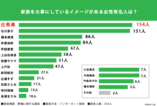 「家族を大事にしているイメージがある女性有名人を教えてください。(複数回答可)」と質問したところ、第1位「辻希美さん」(154人)、第2位「北川景子さん」(151人)、第3位「藤本美貴さん」(86人)という結果になりました。