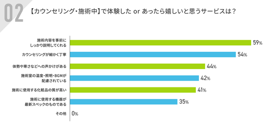 【カウンセリング・施術中】で体験した、またはあったら嬉しいサービスは「施術内容を事前にしっかり説明してくれる」が59%で最多となりました。次いで「カウンセリングが細かく丁寧」が54%と続く結果となりました。