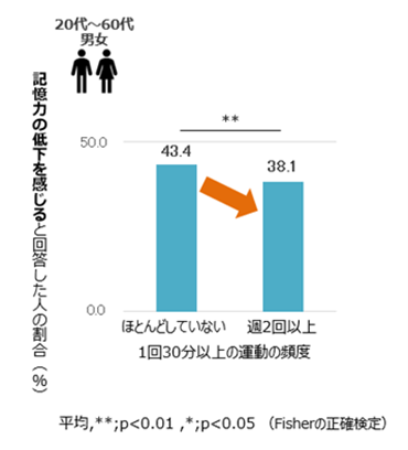 「パーソナルワン」食習慣・生活習慣アンケートにおいて、「週2回以上」の運動習慣(※1回30分以上の運動)のある人は、「ほとんどしていない」と回答した人と比較して、「記憶力の低下を感じる」割合が有意に低いことが分かりました。