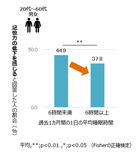 「パーソナルワン」食習慣・生活習慣アンケートにおいて、睡眠時間が「6時間以上」の人は、「6時間未満」の人と比較して、「記憶力の低下を感じる」と回答する割合が有意に低いことが分かりました。
