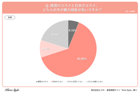 20歳~59歳の女性の女性2,000人に「韓国のコスメと日本のコスメ、どちらの方が購入頻度が高いですか?」というアンケートをとったところ、「日本のコスメの購入頻度が(韓国コスメより)高い」と回答した層が最も多く、63.85%を締めました。一方、「韓国のコスメの購入頻度が(日本より)高い」と回答した層は 6.15%と少数派です。これに「どちらも同じくらい」(9.85%)を足した「韓国コスメ支持層(=韓国コスメを日本と同等かそれ以上に購入する層)」は、全体で 16.0%となりました。