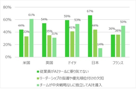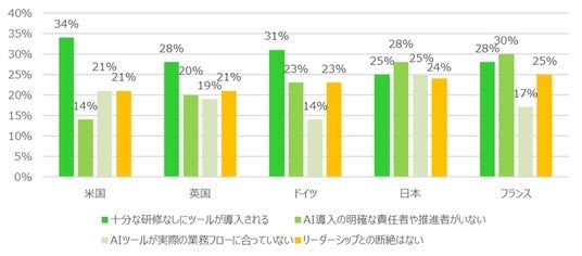 AI導入における最大の課題として、日本では「AI導入の明確な責任者や推進者がいない」(28%)が他国より突出して高くなりました。また、「AIツールが実際の業務フローに合っていない」(25%)という声も多く、トップダウンで導入されたツールが現場のニーズと乖離している可能性が示唆されます。