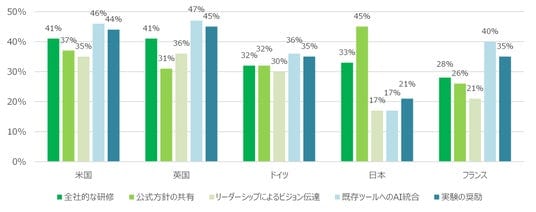 日本の組織は「AI利用に関する公式方針の共有」(45%)では5カ国中トップでした。しかし、「リーダーシップによる明確なAIビジョンの伝達」はわずか17%と、米国(35%)や英国(36%)の半分以下にとどまりました。また、「AI利用に関する研修を受けたことがある」は全体の34%ほどで、ルール作りは進んでいるものの、会社のAI活用ビジョンの浸透と利活用を促進するための教育機会の提供が不足している現状が浮き彫りになりました。