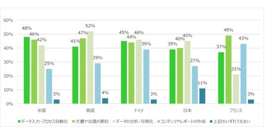 5カ国すべてで、93%以上の従業員が「複数のAIツールが自動で連携し、文脈を共有すること」に価値があると考えており、より統合されたAIエコシステムへの強い期待が示されました。しかし、自律的にタスクをこなす「AIエージェント」に仕事を任せることについては、日本は他国に比べて抵抗感が強く、11%がどのタスクも任せたくないと回答しました(他国は3~4%)。