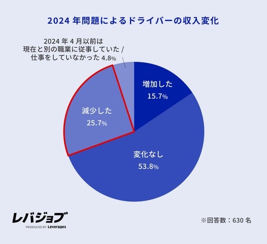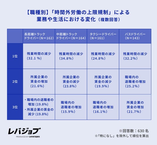 レバレジーズ株式会社が運営するエッセンシャルワーカー向けキャリア支援サービス「レバジョブ」は、ドライバー630名を対象に、時間外労働時間の制限による影響(2024年問題)に関する実態調査を実施しました。
