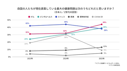 Z世代の健康不安1位「がん」、2年間で13%増 2位「メンタルヘルス」も増加する一方、3位「ストレス」は4%減少 | Ipsos