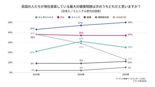 ミレニアル世代の最大の健康問題として最も多かったのは「ストレス(50%)」で、約半数が回答しており、一昨年の43%から7ポイント増加しました。2位は「がん(37%)」、3位は「メンタルヘルス(25%)」となり、過去2年間で上位3項目の順位に変化はありませんでした。