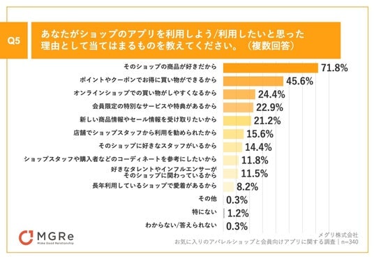 Q3で「アプリがあり、現在利用している」「アプリはないが、あれば利用したいと思う」と回答した方に、「Q5.あなたがショップのアプリを利用しよう/利用したいと思った理由として当てはまるものを教えてください。(複数回答)」(n=340)と質問したところ、「そのショップの商品が好きだから」が71.8%、「ポイントやクーポンでお得に買い物ができるから」が45.6%、「オンラインショップでの買い物がしやすくなるから」が24.4%という回答となりました。