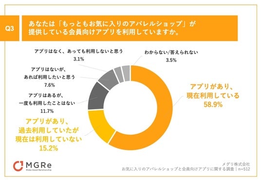 「Q3.あなたは「もっともお気に入りのアパレルショップ」が提供している会員向けアプリを利用していますか。」(n=512)と質問したところ、「アプリがあり、現在利用している」が58.9%、「アプリがあり、過去利用していたが現在は利用していない」が15.2%という回答となりました。