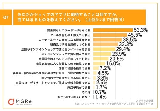 Q3で「アプリがあり、現在利用している」「アプリがあり、過去利用していたが現在は利用していない」「アプリはないが、あれば利用したいと思う」と回答した方に、「Q7.あなたがショップのアプリに期待することは何ですか。当てはまるものを教えてください。(上位5つまで回答可)」(n=418)と質問したところ、「誕生日などにクーポンがもらえる」が53.3%、「セール情報を早く教えてくれる」が45.5%、「コーディネートの参考になる提案がある」が38.5%という回答となりました。