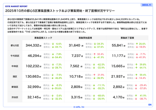 日本最大級の商業用不動産データ分析基盤「estie マーケット調査」を中心に複数のサービスを提供する株式会社estie(本社:東京都港区、代表取締役:平井 瑛、以下「estie」)は、「estie マーケット調査」による分析データをまとめた最新不動産マーケット動向レポート「エスティ マーケットレポート」2025年11月号を配信開始しました。
