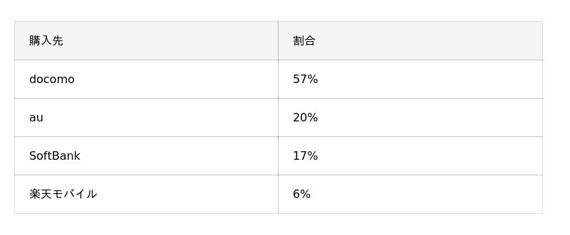 以下、「au(KDDI)」が2割、「SoftBank」が約2割弱、「楽天モバイル」が1割未満という割合です。ドコモ経由で購入するユーザーの多さが際立っています。