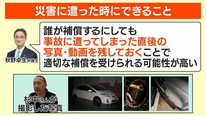 災害の被害に遭った際、私たちにできることとして、災害に関する問題に詳しい秋野卓生弁護士によると、「誰が補償する場合でも、事故に遭ってしまった直後の写真・動画を残しておくことで適切な補償を受ける可能性が高い」ということです。