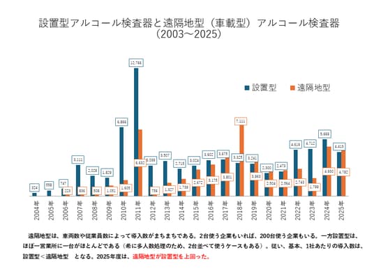 設置型アルコール検査器と遠隔地型(車載型)アルコール検査器(2003~2025)