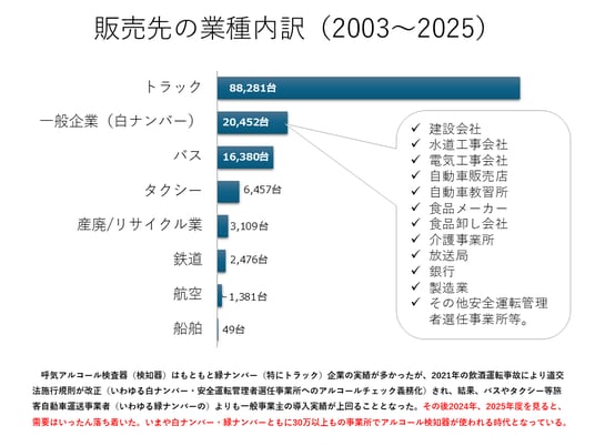 本レポートにより2003年以降の22年間の納入先業種や機種をご確認いただけます。例えば当社の場合、個人向けの簡易型アルコール検知器は1割程度であり、9割が「デジタル記録型」です。