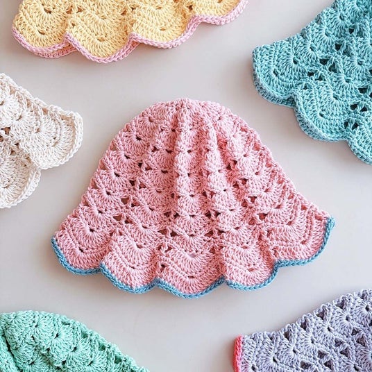 かぎ編み:かぎ針を使って糸を引っかけ、ループ状に編んでいく手芸の技法。