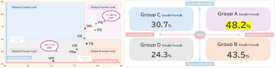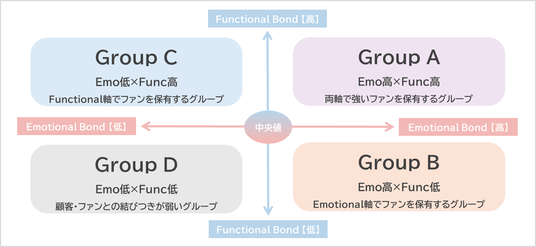 この「Emotional Bond」「Functional Bond」を指標に、調査対象各社の中央値を取り4象限に分類した「EF*マトリクス」を作成。