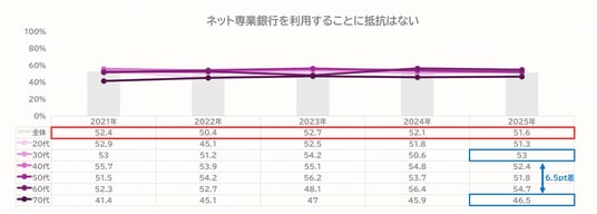 銀行のデジタル化が“当たり前”になりつつある一方で、「ネット専業銀行を利用することに抵抗はない」と回答したのは、全体で51.6%となり、ここ5年は横ばいとなっています。最も抵抗を感じている70代が46.5%、感じていないのが30代53.0%で、その差もわずか6.5ポイントと年代による差はあまりない結果となりました。