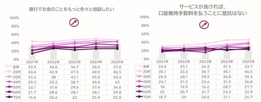 実際に、「銀行でお金のことをもっと色々と相談したい」「サービスが良ければ、口座維持手数料を払うことに抵抗はない」という意識が、すべての年代で2021年より上昇しており、特に若年層はいずれも半数近い回答率となりました。
