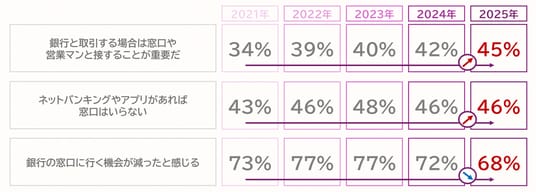一方で、「ネットバンキングやアプリがあれば窓口はいらない」という意識は3ポイント増加し、「銀行の窓口に行く機会が減ったと感じる」という意識も2021年より5ポイント減少しました。これらの結果から、窓口の重要性は2021年より全体で上昇傾向にあり、銀行窓口が必要と考える人と不要と考える人がほぼ半々となっています。現在はまさにデジタルバンク化への過渡期であると考えられます。