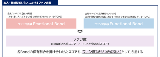 このような背景を踏まえ、加入・継続型ビジネスにおけるファン像・そしてその定義がより実態に近いものとなるよう、企業やサービスとの情緒的な結びつきである「Emotional Bond(横軸)」と、実利・機能価値享受による結びつきである「Functional Bond(縦軸)」の2つの要素を用い、ファンの定義を行いました。また、この2つの軸のスコアの掛け合わせにより、ファン度(顧客と企業との結びつきの強さ)を表します。