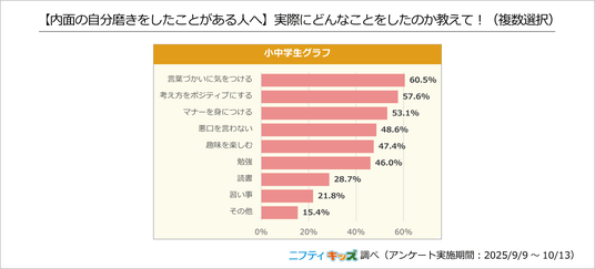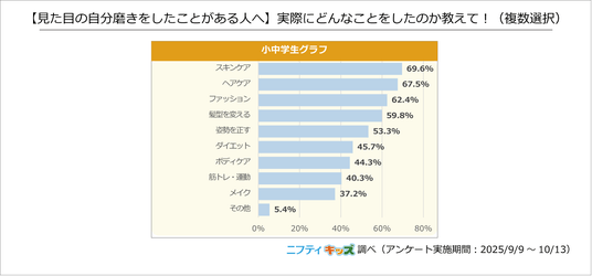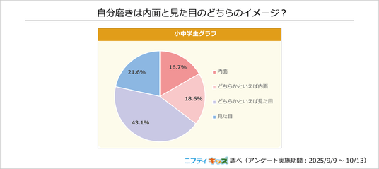 自分磨きのイメージについては、小中学生の約6割が「見た目」または「どちらかといえば見た目」と回答し、実際に自分磨きをしたことがある人は83.7%でした。具体的な取り組みとしては、見た目では「スキンケア」「ヘアケア」「ファッション」、内面では、「言葉づかいに気をつける」「考え方をポジティブにする」に多くの票が集まりました。