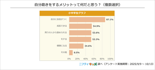 お手本として意識されている人物もクラスの友だちからメディアで活躍する人まで多岐にわたり、子どもたちがそれぞれの理想像を思い描きながら取り組んでいる様子がうかがえます。自分磨きのメリットについては、「自分に自信がつく」と回答した人が8割を超え、見た目や内面を整えることが自己肯定感や前向きな気持ちにつながっていることがわかりました。