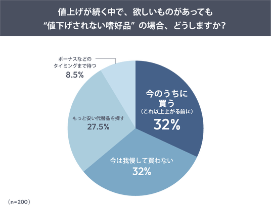 また、「もっと安い代替品を探す」(27.5%)という回答も多く、「値下げを待つ」よりも「後悔しないうちに買う」――