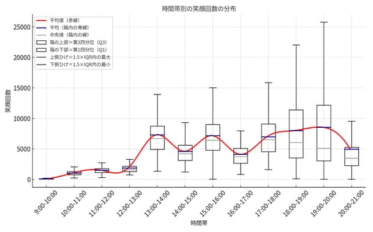 1日の中での変化を見ると、13時台から徐々に上昇し、19時台にピークを迎え、17時以降は閉館近くまで一定の水準が保たれていました。来館者の多い時間帯のほうが笑顔の割合が高くなっており、周りの笑顔が自身の笑顔を引き出す要因となっている可能性が示唆されます。