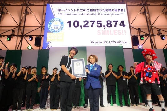 会期中の184日間で、笑顔検知ツールで集めた笑顔の数が1,000万回を超えたことで、「単一イベントにてAIで検知された笑顔の最多数」としてギネス世界記録(TM)に認定され、10月13日夜に『よしもとwaraii myraii館』にて公式認定証が授与されました。