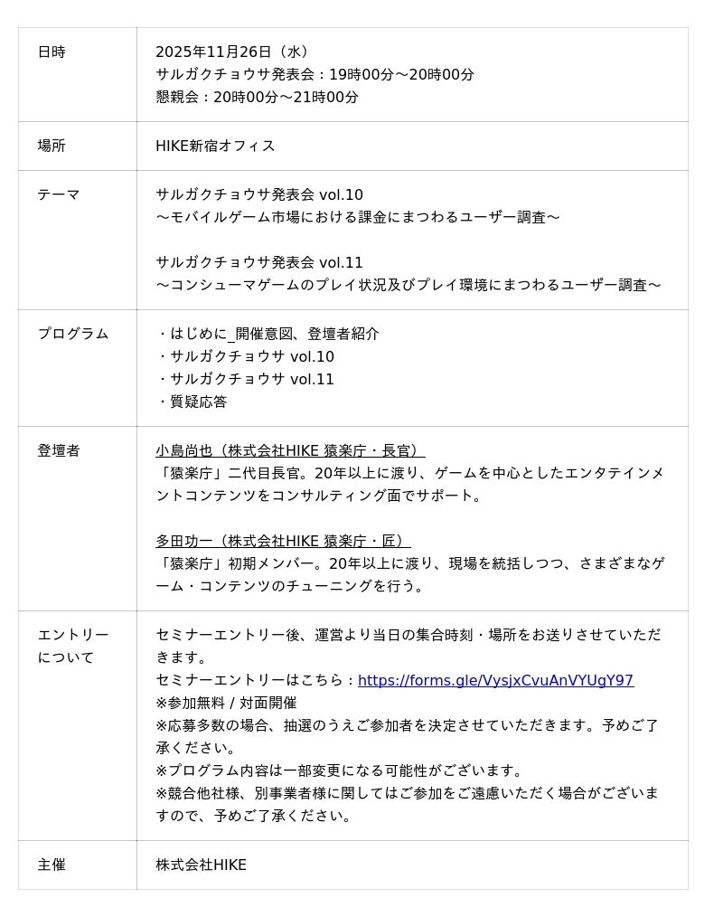 株式会社HIKE(本社:東京都新宿区、代表取締役:三上政高、以下「HIKE」)のチューニング・検証事業を担う猿楽庁(長官:小島尚也)は、2025年11月26日(水)に無料セミナー「サルガクチョウサ発表会」を開催致します。本セミナーでは猿楽庁の長官・小島尚也と匠・多田功一が、「サルガクチョウサ vol.10 ~モバイルゲーム市場にまつわるユーザー調査~」と「サルガクチョウサ vol.11 ~コンシューマゲームのプレイ状況及びプレイ環境にまつわるユーザー調査~」の調査背景や深掘りした内容についてご説明いたします。「サルガクチョウサ発表会」初の対面開催となり、セミナー後に懇親会の実施も予定しております。ぜひご参加ください。